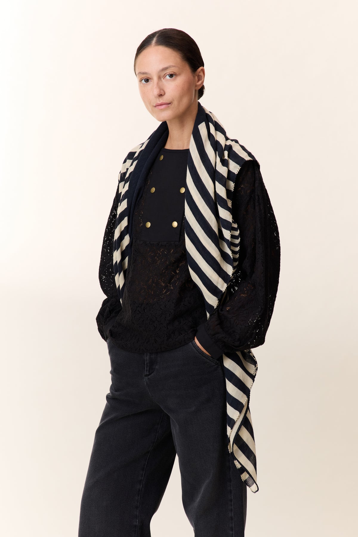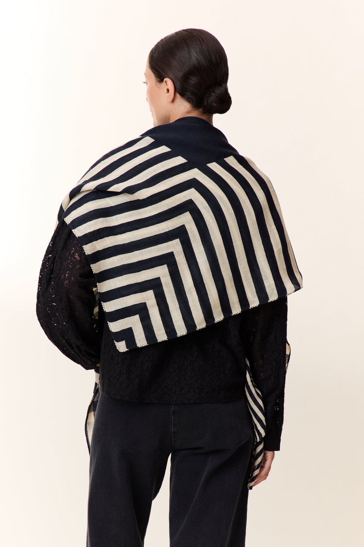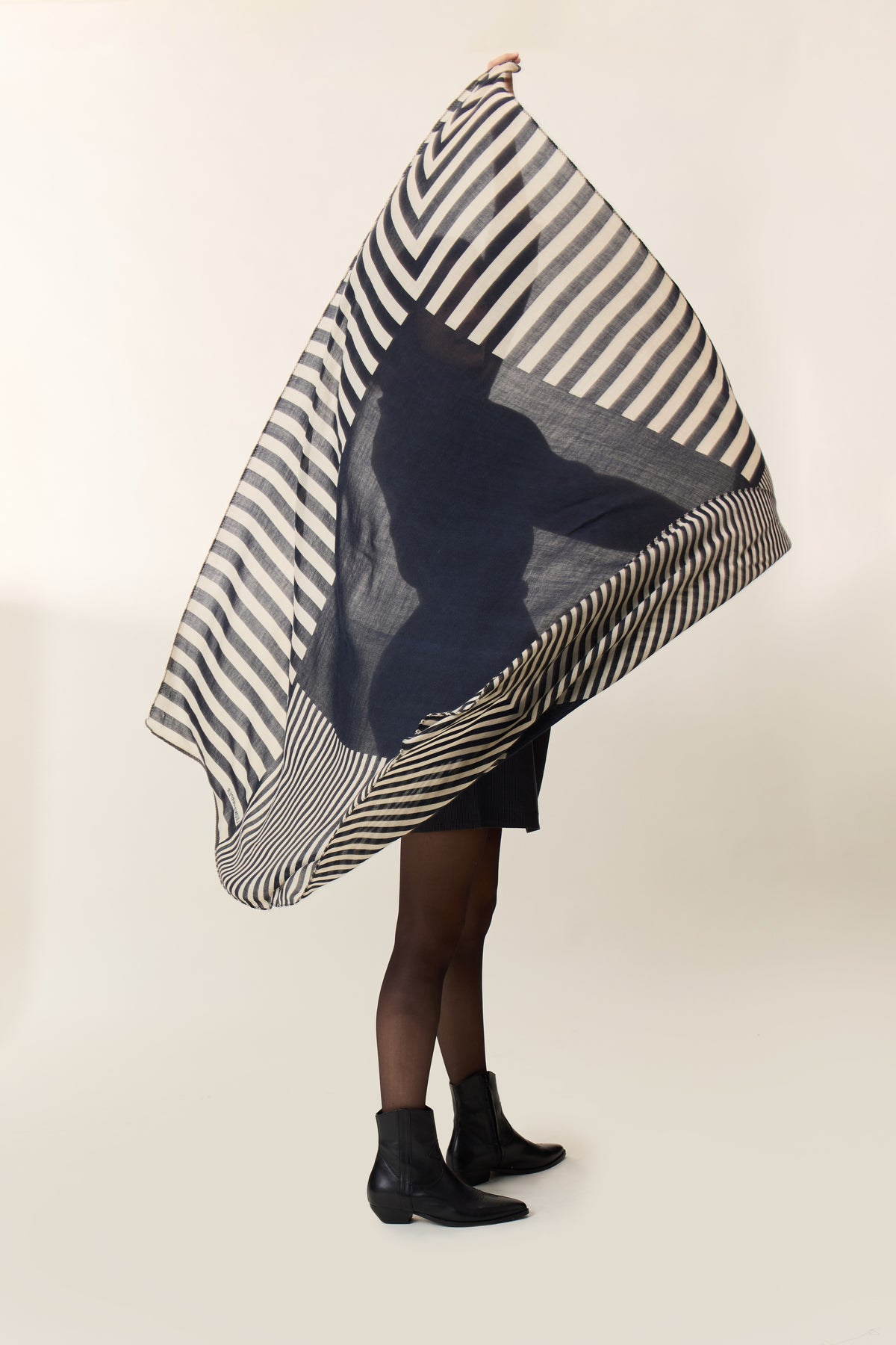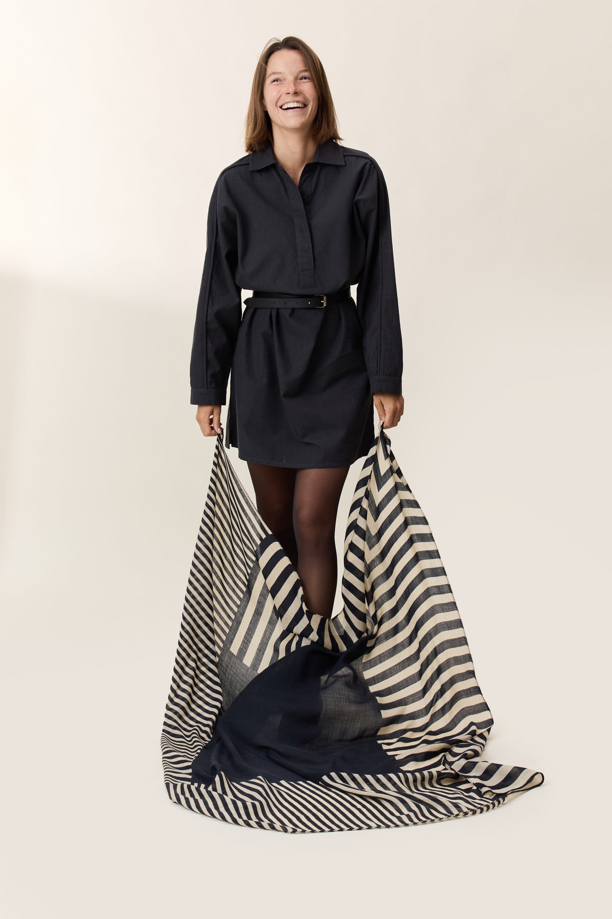 L’écharpe Emile Lines s’affirme par un motif à rayures graphiques, travaillées dans des largeurs et orientations contrastées. Son tombé ample offre une véritable liberté de mouvement. La laine douce assure confort et chaleur, tandis que les finitions précises des bords traduisent une exigence de qualité. Cette pièce donne du relief à la silhouette et s’invite facilement sur un look minimaliste ou sur un jean et un pull, pour une allure décontractée.