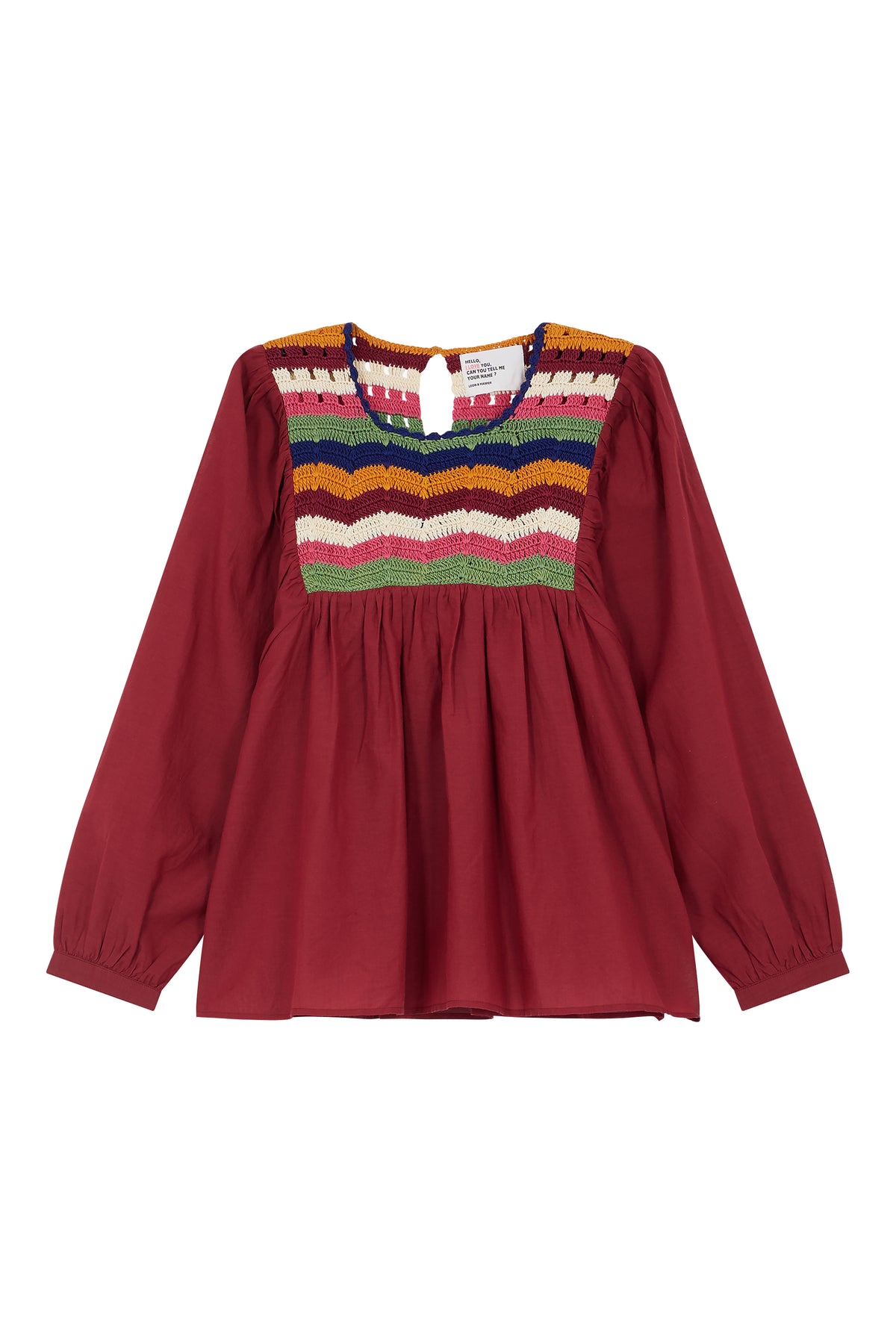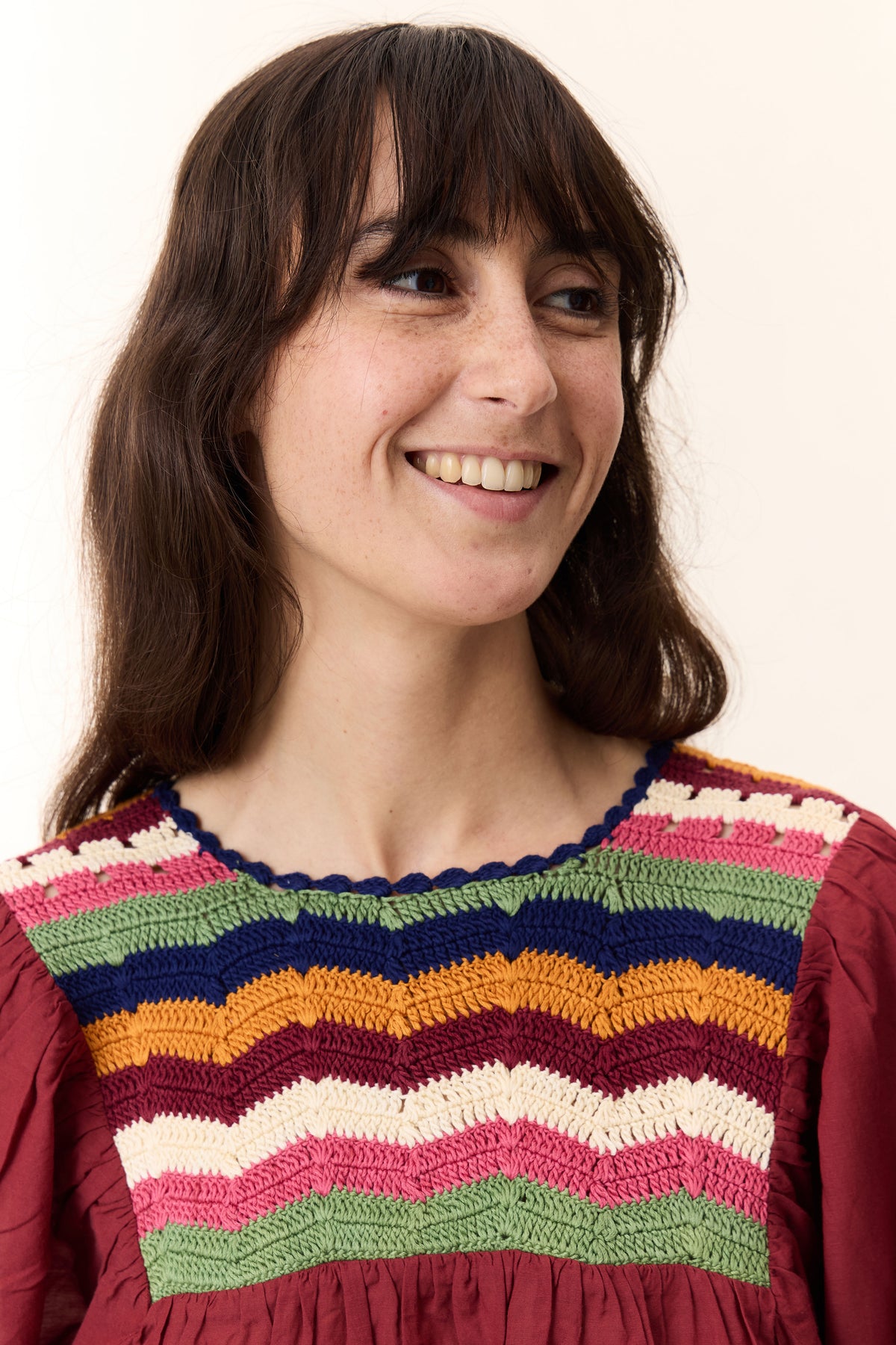 Avec son plastron en crochet multicolore fait à la main et sa coupe fluide, la blouse Criq Crochet est une pièce pleine de caractère et de douceur. Parfaite pour une allure bohème chic, elle s’impose comme un incontournable de la saison, alliant confort et originalité.