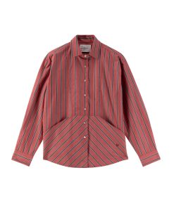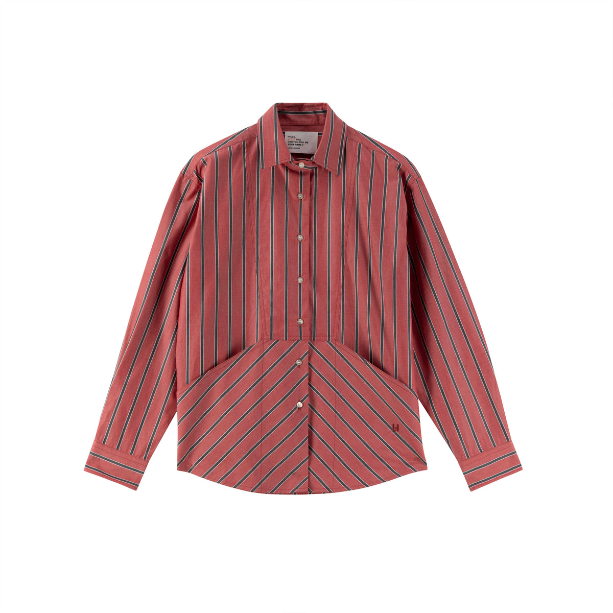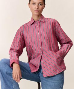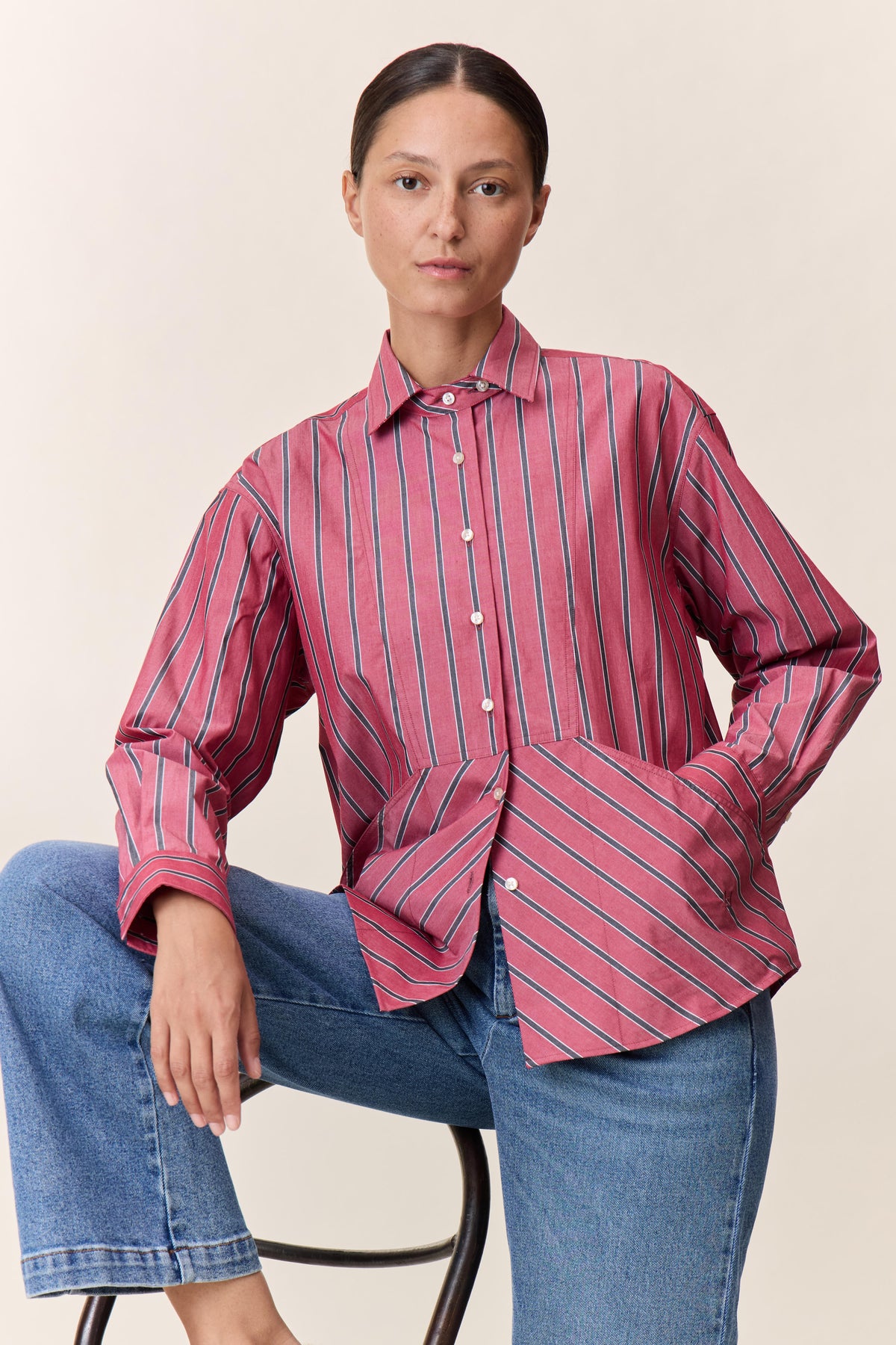 Jeu graphique de rayures verticales sur le haut et les manches, croisées par des rayures obliques sur le bas du devant, la chemise Chez Strp incarne tout le twist Leon & Harper. Sa coupe ample révèle une silhouette au charme actuel, tandis que sa confection 100% coton assure une tenue fluide et une sensation agréable à porter. Col classique, patte de boutonnage discrète, et manches longues laissant la place à une allure plus détendue si on les roule. Les poches sont intégrées dans le motif, pour renforcer l’esprit graphique maison. Idéale avec un jean ou un pantalon large de la collection.