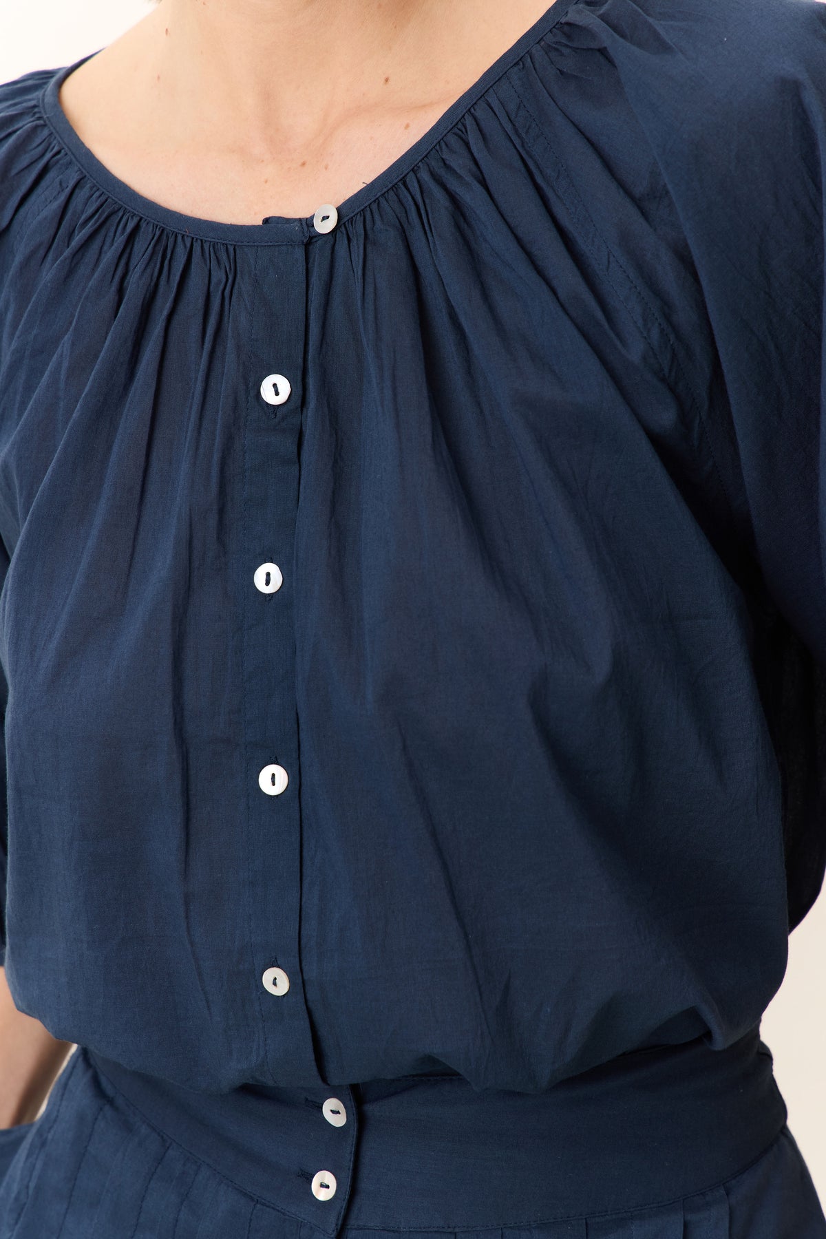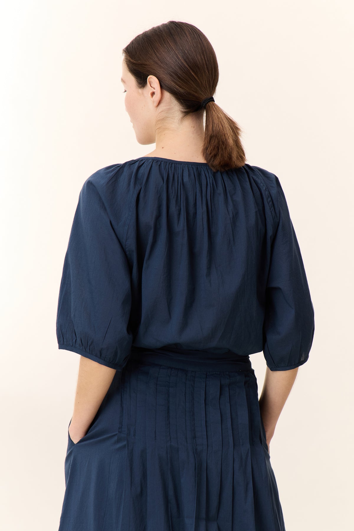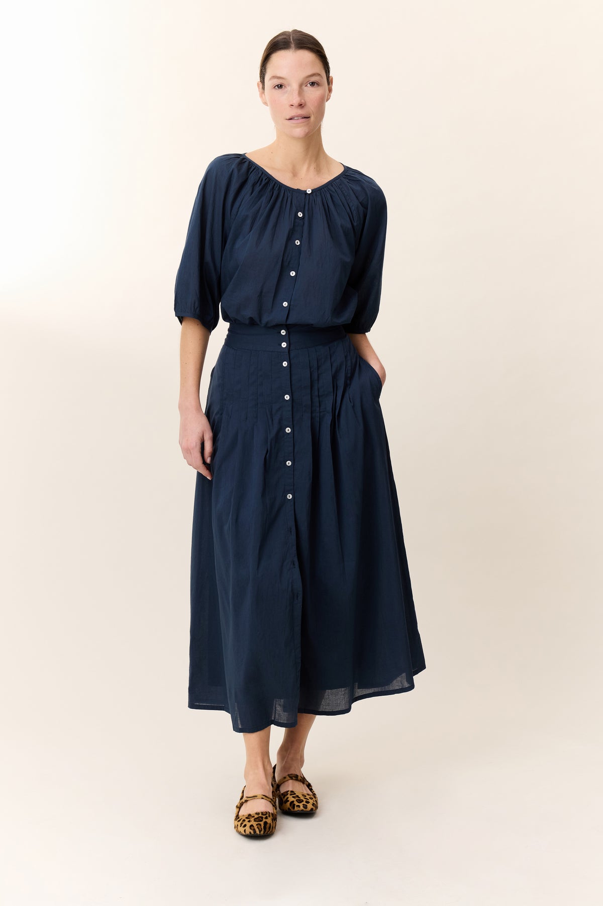 Avec sa coupe fluide et ses manches ballons, la blouse Cool Pleat offre une élégance naturelle et décontractée. Ses plis délicats ajoutent une touche de sophistication. La femme Leon & Harper la porte rentrée dans un pantalon taille haute ou ouverte sur un débardeur pour un look estival et romantique.
