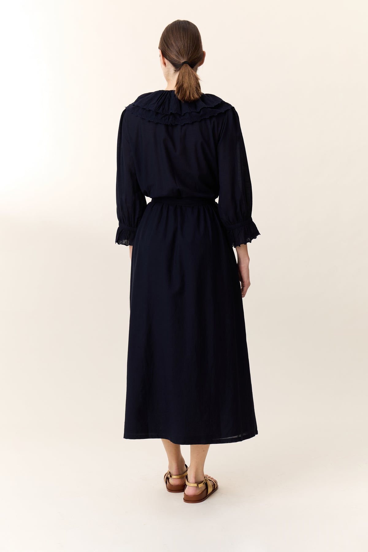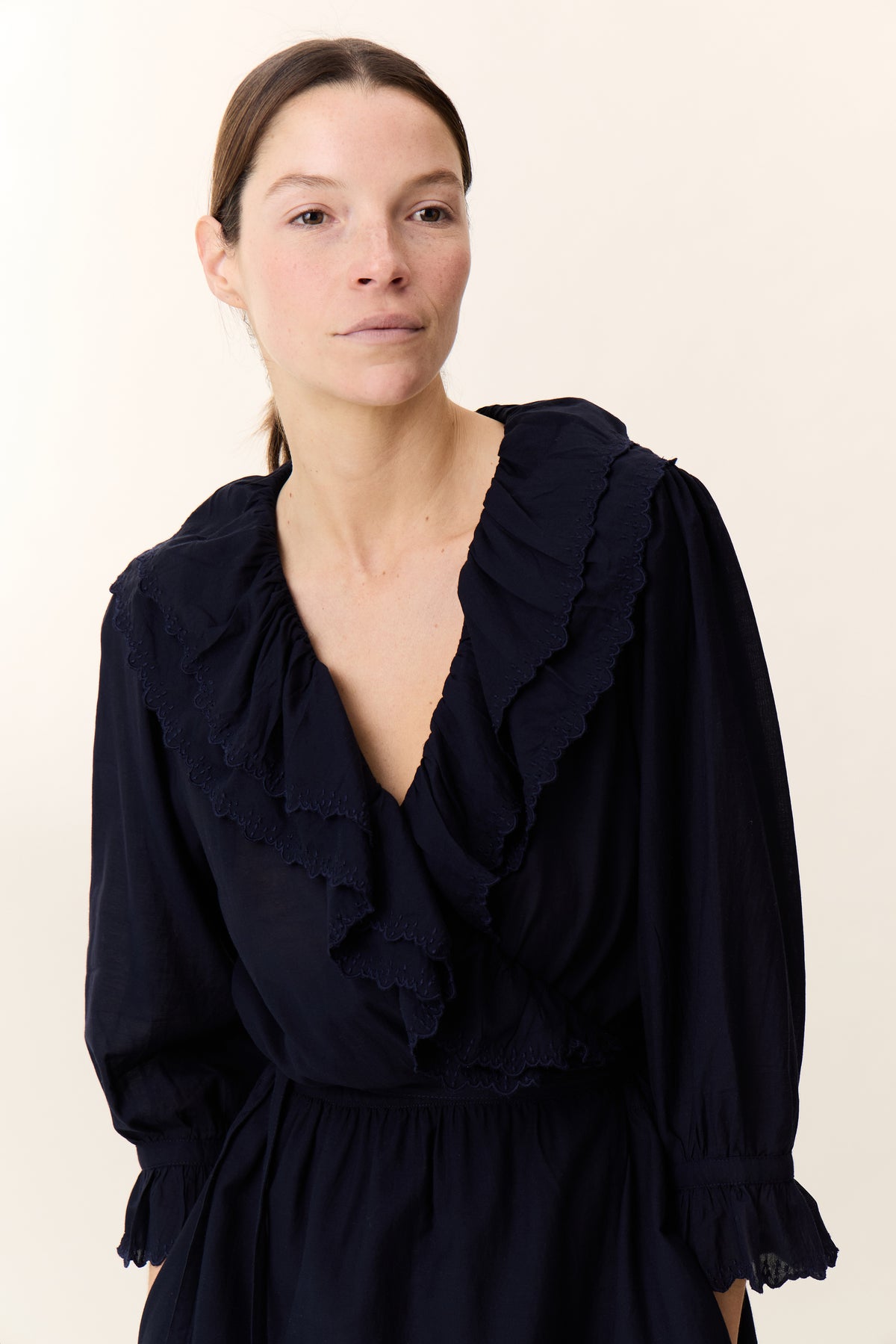 La robe Reem Plain incarne une élégance intemporelle avec une touche romantique et féminine. Sa coupe portefeuille sublime la silhouette avec un drapé naturel. Son encolure en V, ornée de volants superposés, apporte une note sophistiquée. Les manches longues semi-transparentes, agrémentées de poignets volantés, ajoutent une dimension raffinée et délicate. Confectionnée dans un tissu fluide et léger, elle offre à la femme Leon & Harper un confort optimal tout en restant élégante.