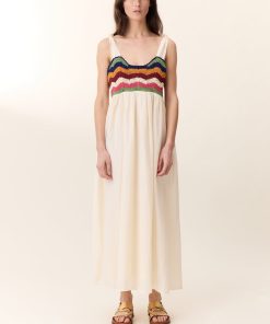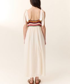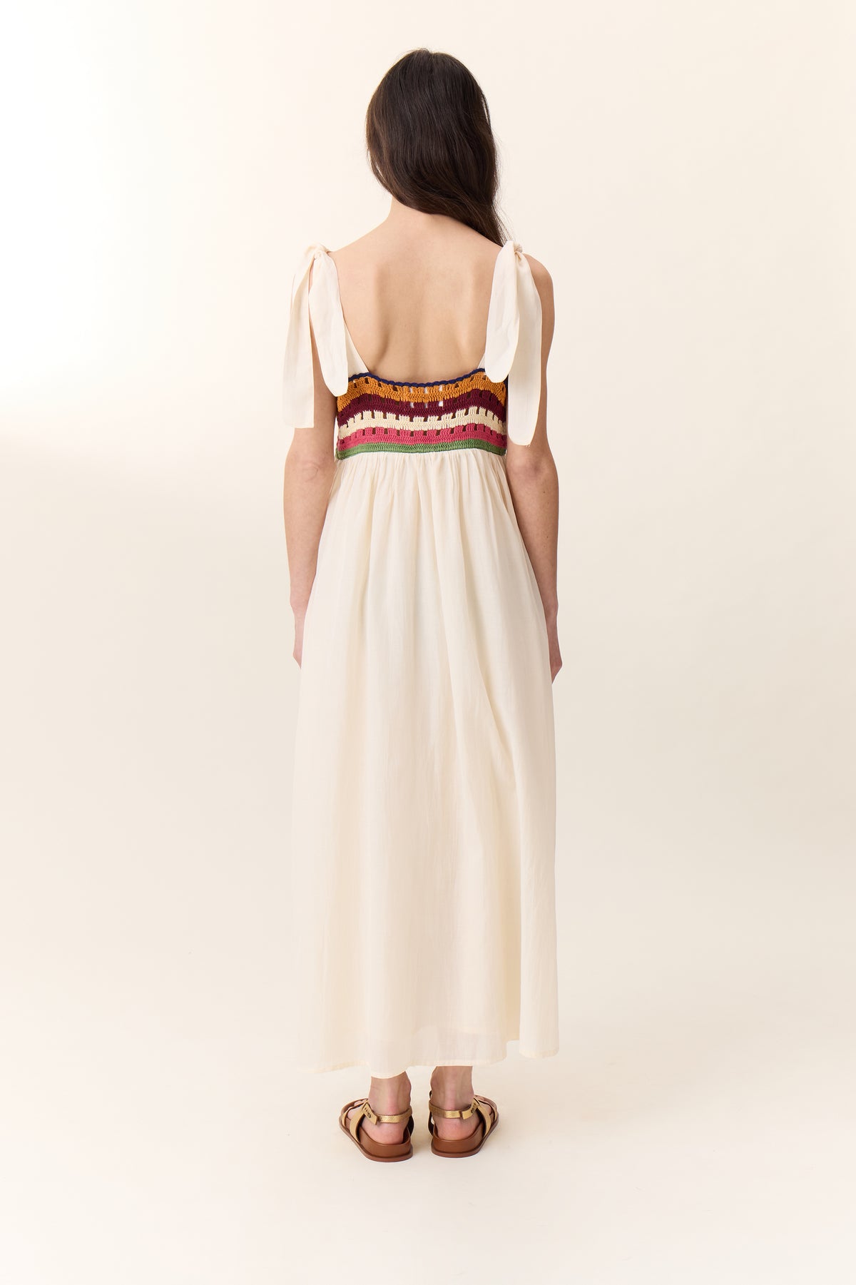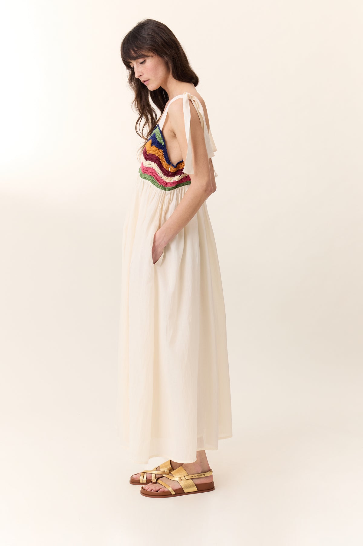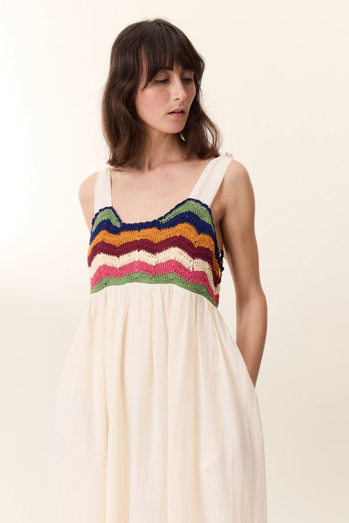 La robe Ricq Crochet se distingue par son jeux de matière avec son plastron en crochet fait main et son voile en coton. Ses jolies bretelles à nouer et son décolleté dégagé subliment la silhouette féminine de la femme Leon & Harper offrant une allure bohème et élégante.