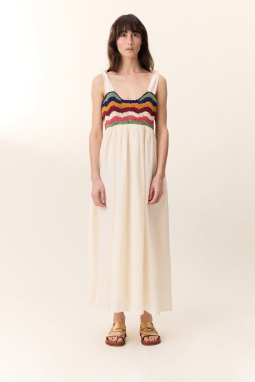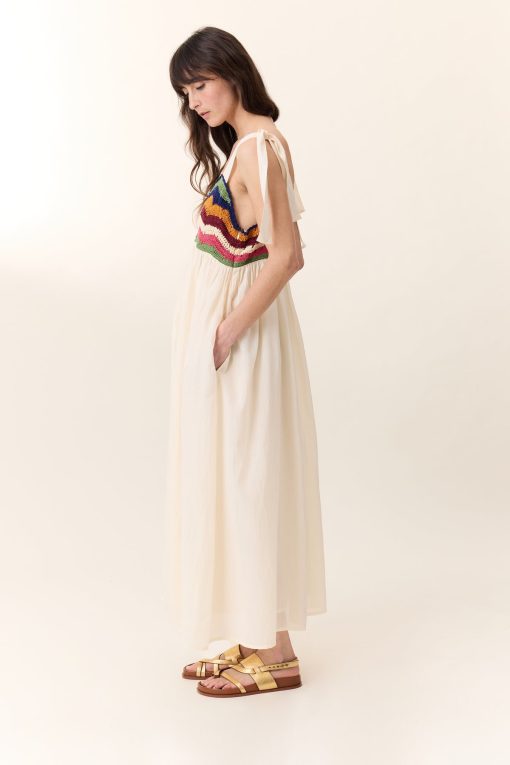 La robe Ricq Crochet se distingue par son jeux de matière avec son plastron en crochet fait main et son voile en coton. Ses jolies bretelles à nouer et son décolleté dégagé subliment la silhouette féminine de la femme Leon & Harper offrant une allure bohème et élégante.