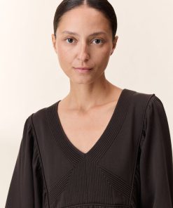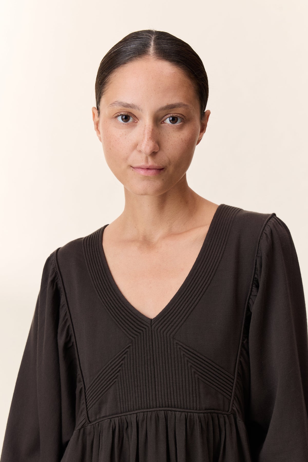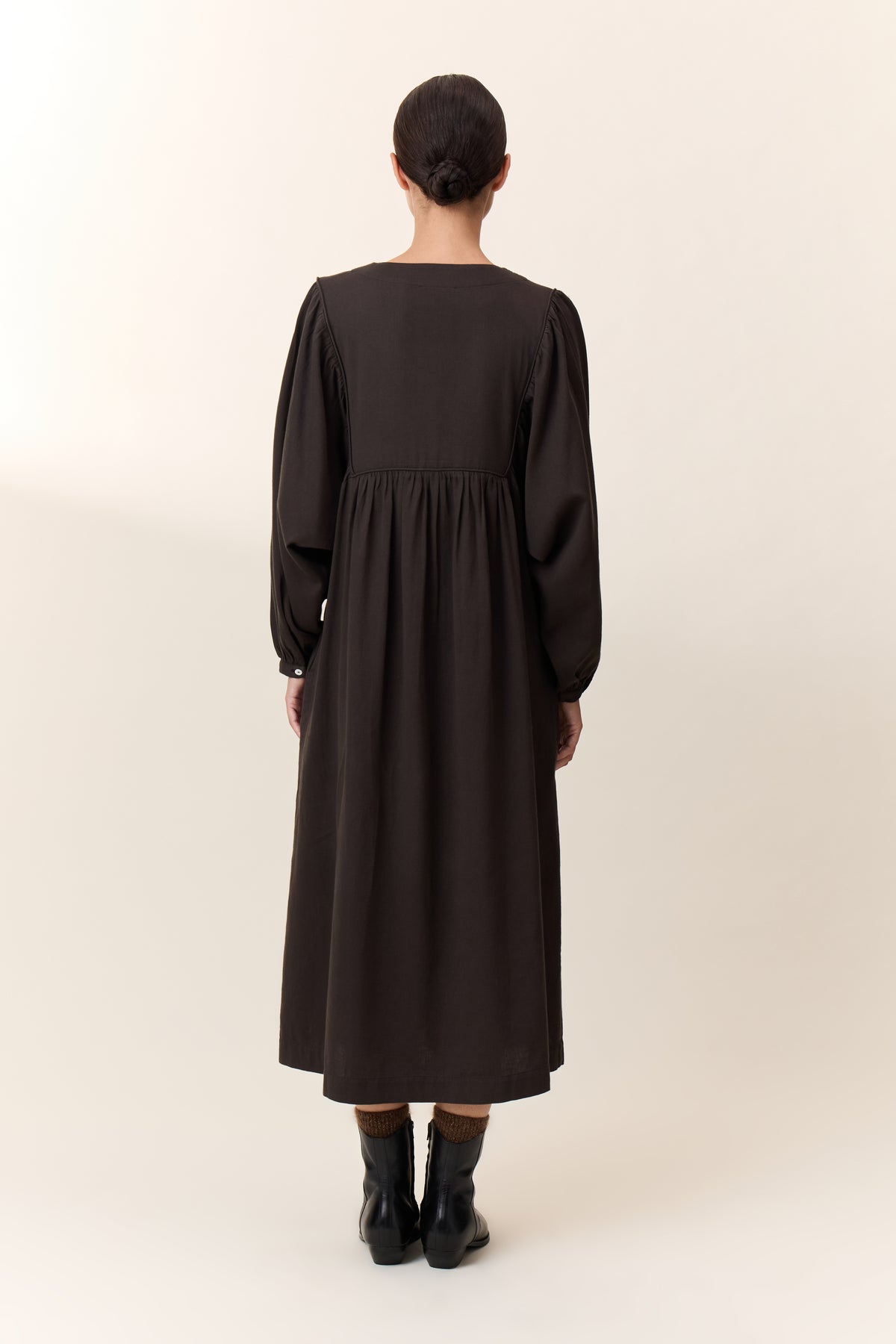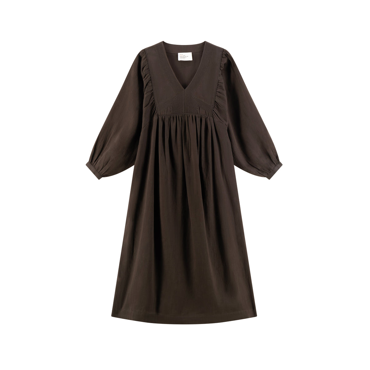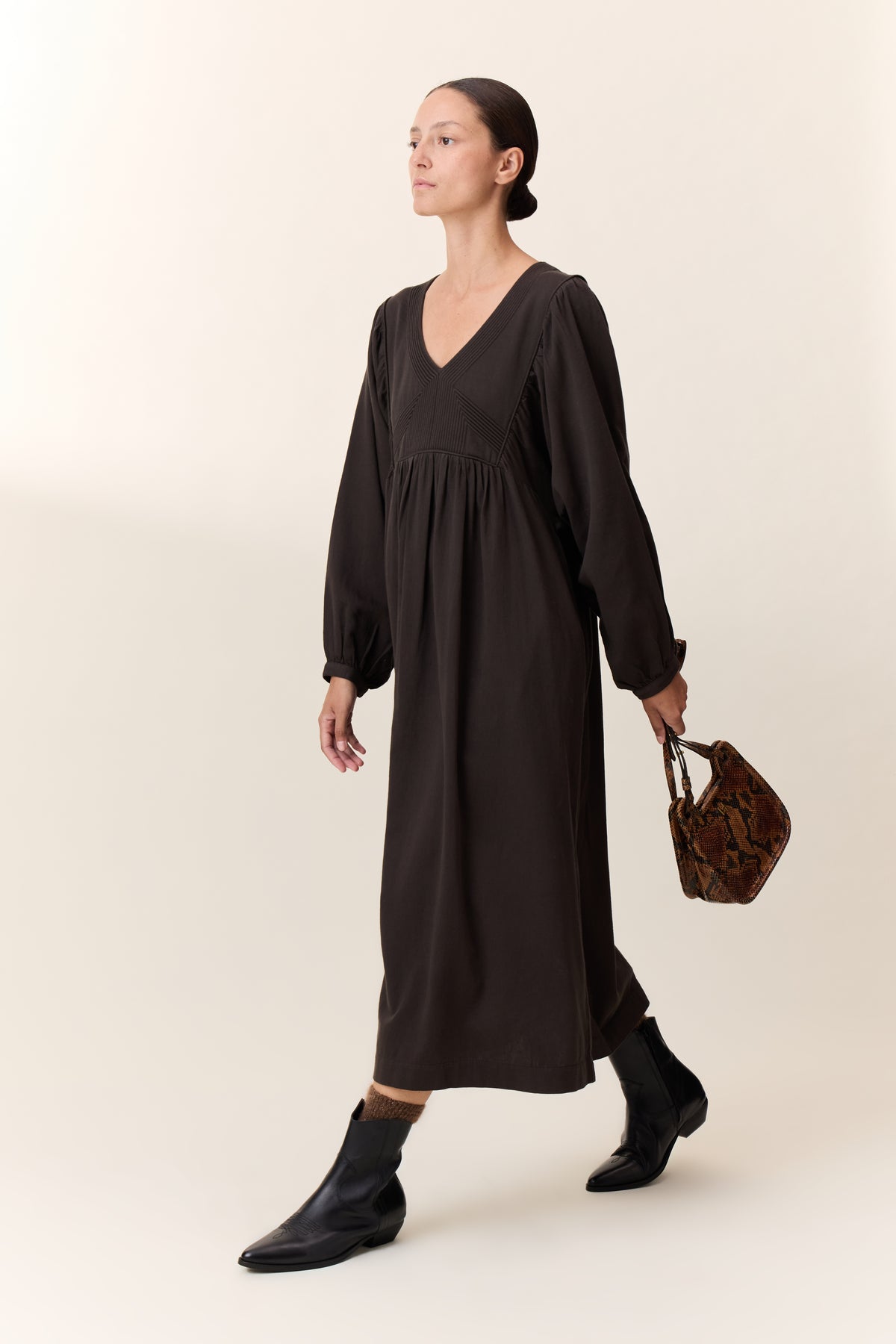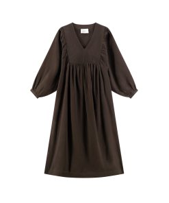 La robe Rida Cord offre une liberté de mouvement grâce à sa coupe longue et sa fluidité naturelle. Le décolleté en V, structuré par des pinces sur le buste, accentue discrètement la silhouette. Les poignets élastiqués soulignent le volume des manches et apportent une note contemporaine, tandis que la taille, subtilement marquée, assure une aisance parfaite. Portez-la avec des bottes pour affirmer un style bohème, ou optez pour des sandales pour une allure plus légère.