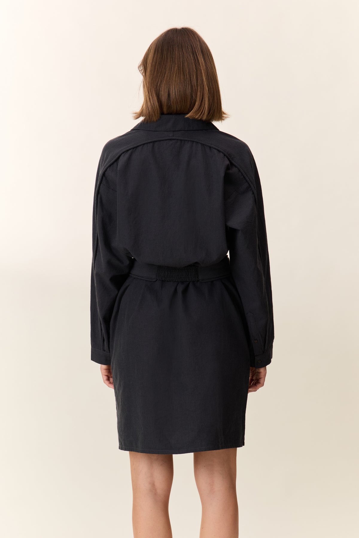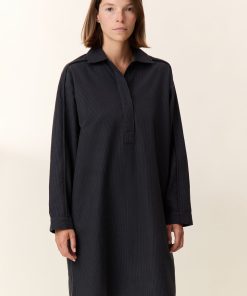 La robe Roby Strp puise dans l’esprit intemporel de Leon & Harper avec sa coupe droite et son col chemise souligné par une patte de boutonnage courte. Le tissu en coton, rehaussé de fines rayures verticales, marque l’attention portée aux détails tout en offrant du relief à la silhouette. Les manches longues finies par des poignets structurent la pièce, alors que la ceinture amovible à boucle métallique dessine une taille ou d’adopter un porté plus ample. Elle est facile à mixer avec des bottines ou des baskets pour revisiter chaque instant avec modernité.