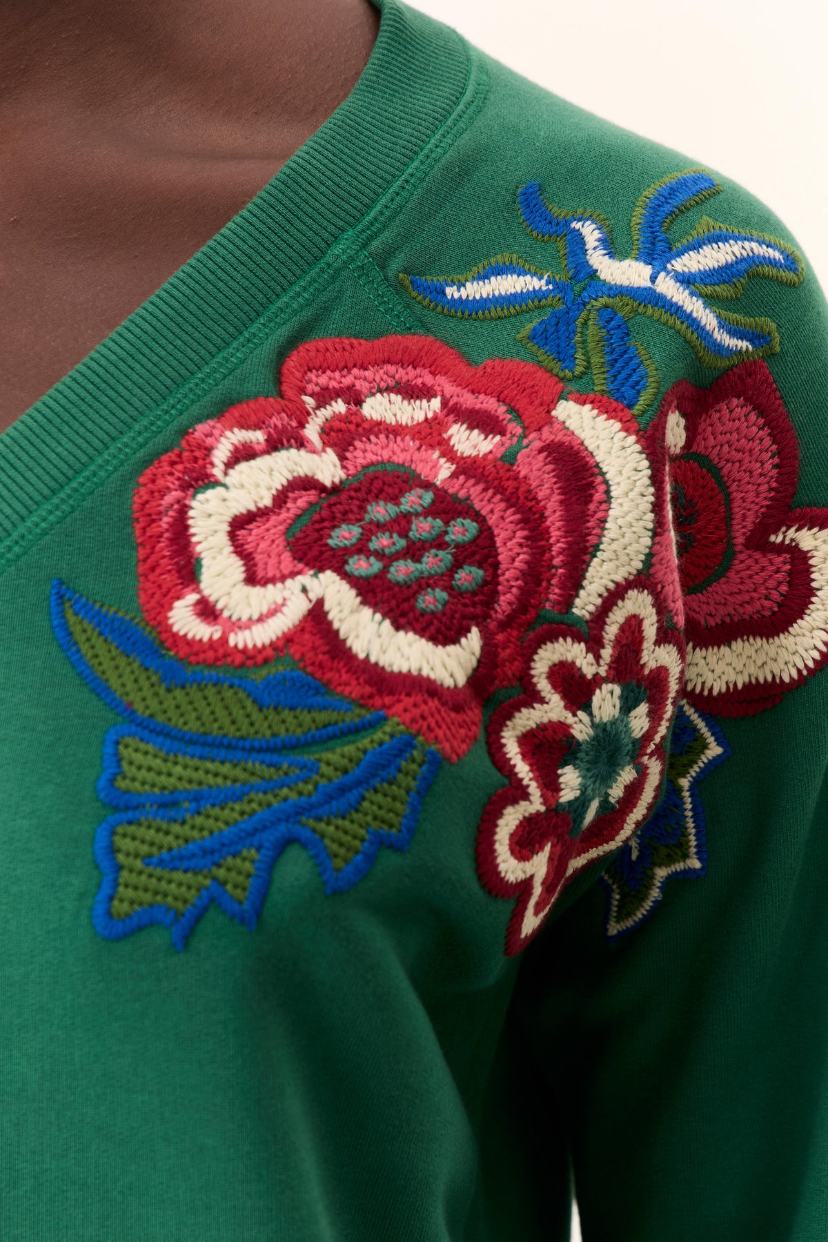 Le sweat Shavi Flowers est une pièce confortable et élégante, parfaite pour une allure décontractée avec une touche de sophistication. Son tissu doux et épais en fait un choix idéal pour les journées fraîches. Son col en V flatteur avec sa broderie florale colorée sur l’épaule, ajoutent une note raffinée. Avec sa coupe légèrement ample et ses finitions côtelées aux poignets et à la taille, il assure un look moderne et cosy, parfait à associer avec un jean ou une jupe pour une tenue casual-chic.