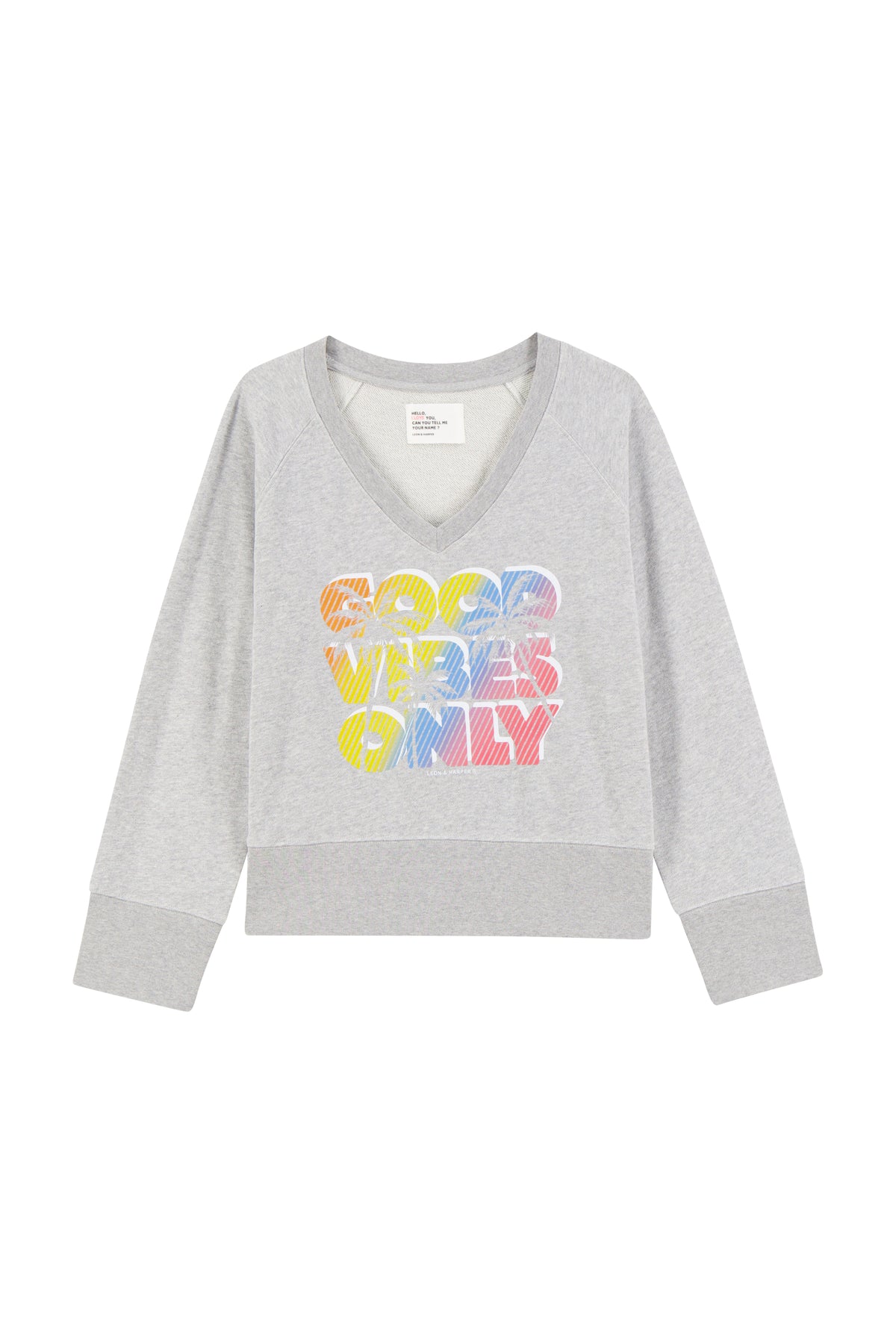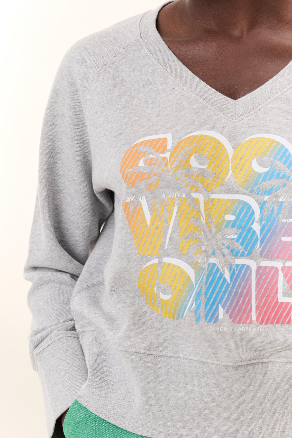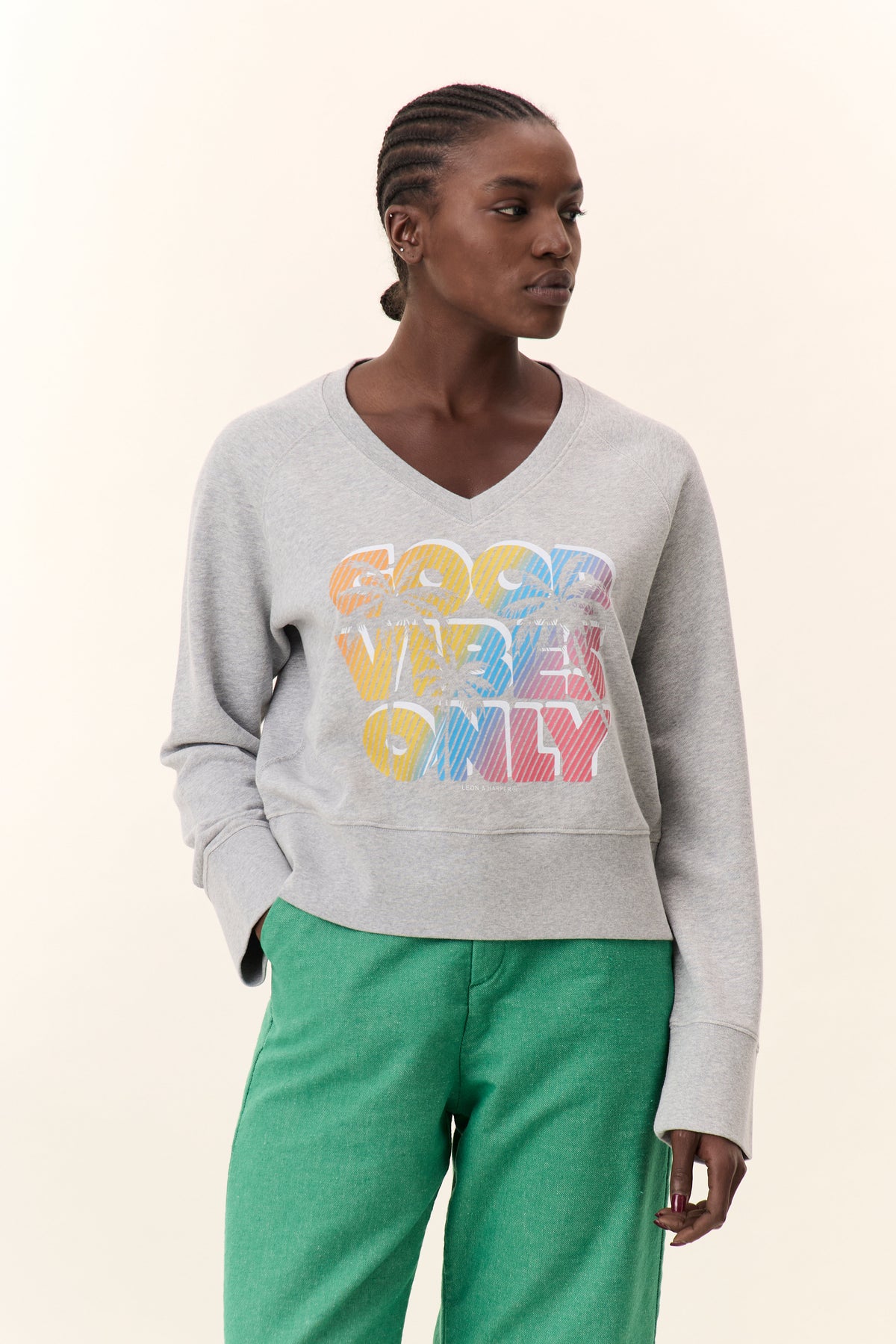 Le sweat Shavi Only est une pièce casual et vibrante, idéale pour un look décontracté. Son inscription « »Good Vibes Only » », accompagnée de palmiers lui confèrent une ambiance estivale et positive. La femme Leon & Harper l’associe avec un jean ou une jupe pour look casual chic empreint de bonne humeur et d’énergie positive.