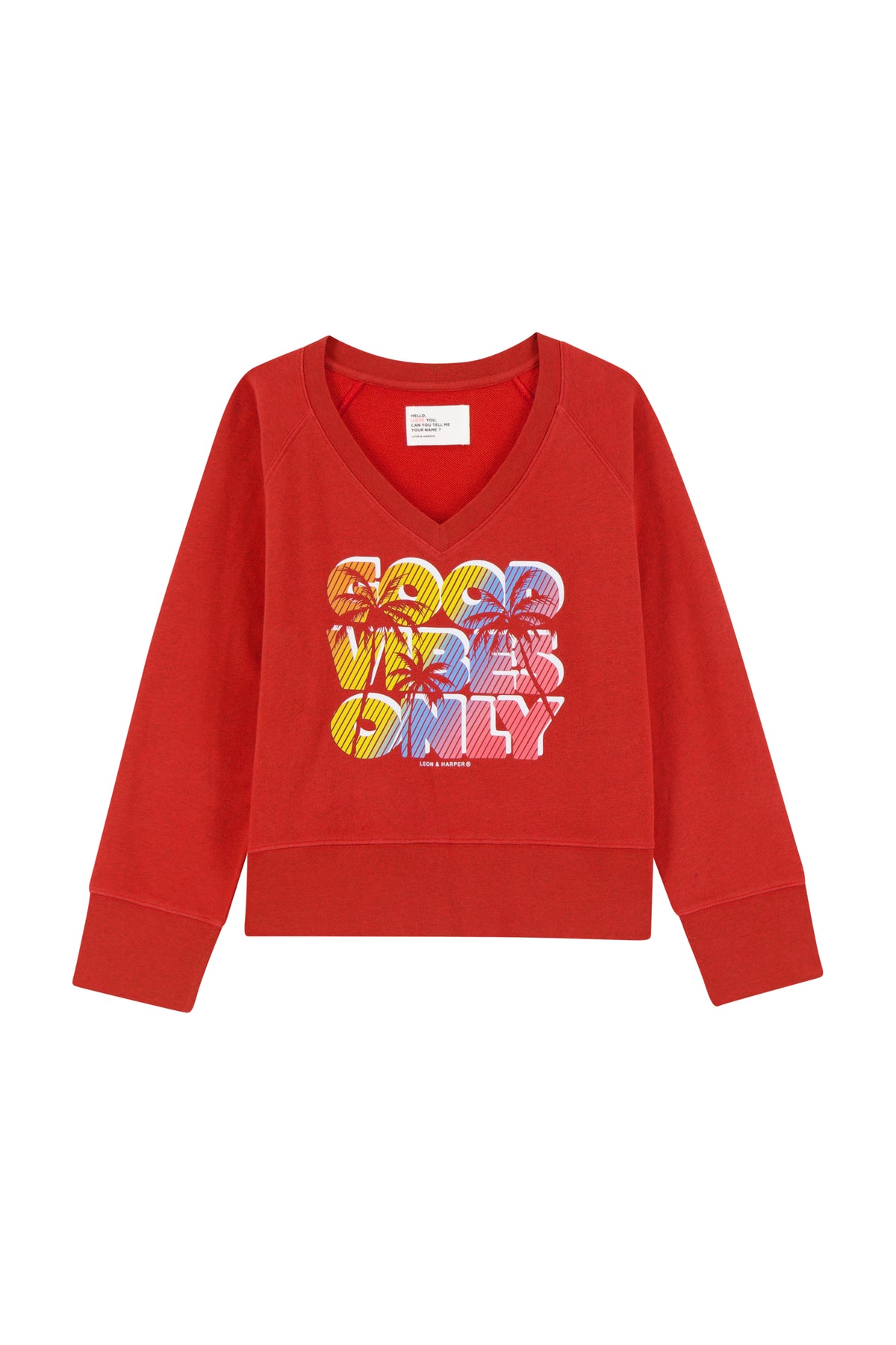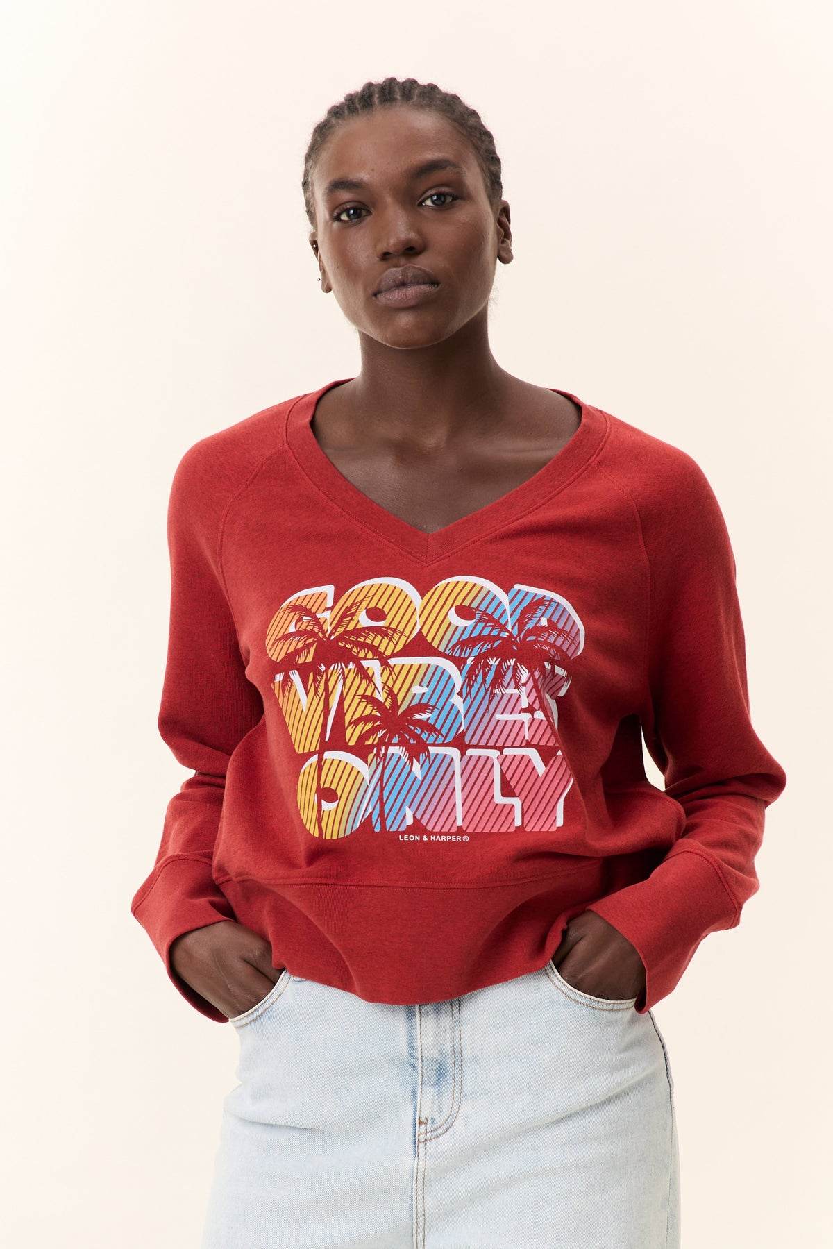 Le sweat Shavi Only est une pièce casual et vibrante, idéale pour un look décontracté. Son inscription « »Good Vibes Only » », accompagnée de palmiers lui confèrent une ambiance estivale et positive. La femme Leon & Harper l’associe avec un jean ou une jupe pour look casual chic empreint de bonne humeur et d’énergie positive.