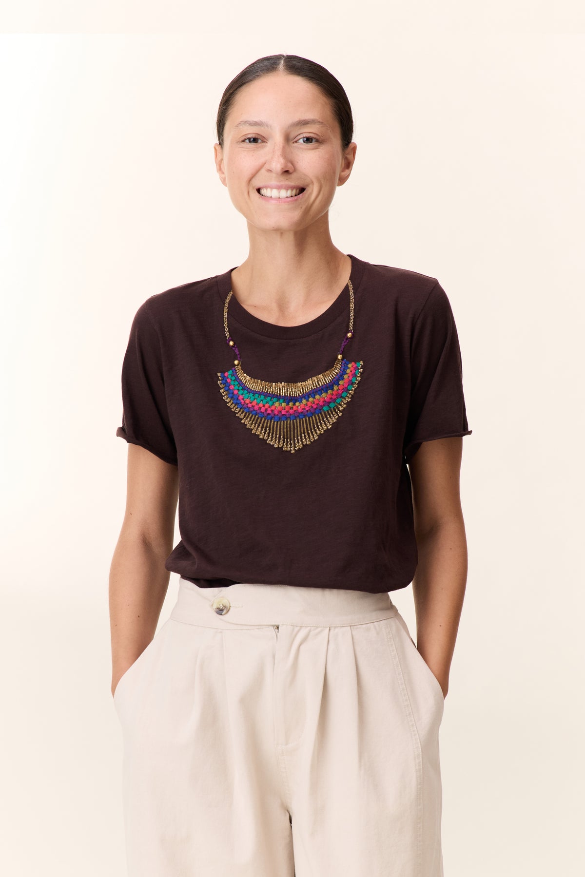 Le t-shirt Toro Collier s’impose comme un essentiel revisité. Composé en 100% coton organique , il mise sur une maille douce au tombé naturel, pensée pour la liberté au quotidien. Le col rond révèle un motif appliqué qui rappelle un collier, souligné par des détails texturés et une finition nette. Portez-le aussi bien avec un jean pour une démarche cool qu’avec une veste pour un look plus affirmé.