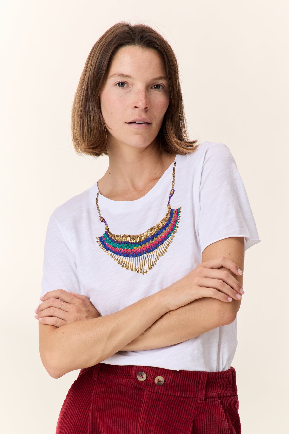 Le t-shirt Toro Collier s’impose comme un essentiel revisité. Composé en 100% coton organique , il mise sur une maille douce au tombé naturel, pensée pour la liberté au quotidien. Le col rond révèle un motif appliqué qui rappelle un collier, souligné par des détails texturés et une finition nette. Portez-le aussi bien avec un jean pour une démarche cool qu’avec une veste pour un look plus affirmé.